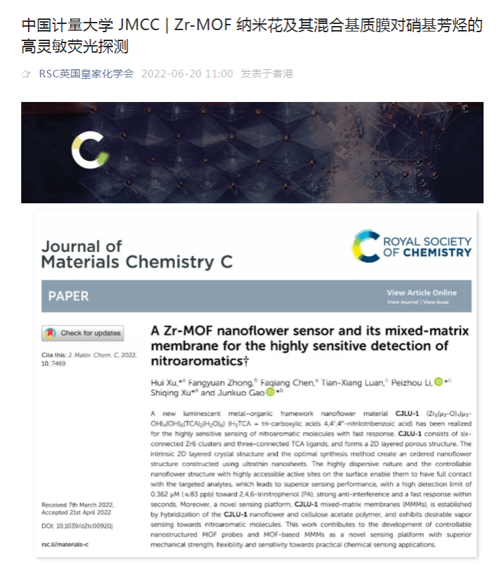 光学工程学科教师在国际材料著名期刊J.Mater.Chem.C发表热点论文 近日,我校光电学院徐时清团队在多孔MOFs材料混合基质膜做环境污染物硝基芳烃的高效荧光传感取得重要进展,相关成果以“A Zr-MOF nanoflower sensor and its mixed-matrix membrane for the highly sensitive detection of nitroaromatics ”为题发表在国际著名期刊J. Mater. Chem. C上(IF=7.393),并入选为期刊热点文章(HOT Papers)。光电学院青年教师徐绘为文章的第一作者,中国计量大学为第一通讯单位。同时,该工作被RS...